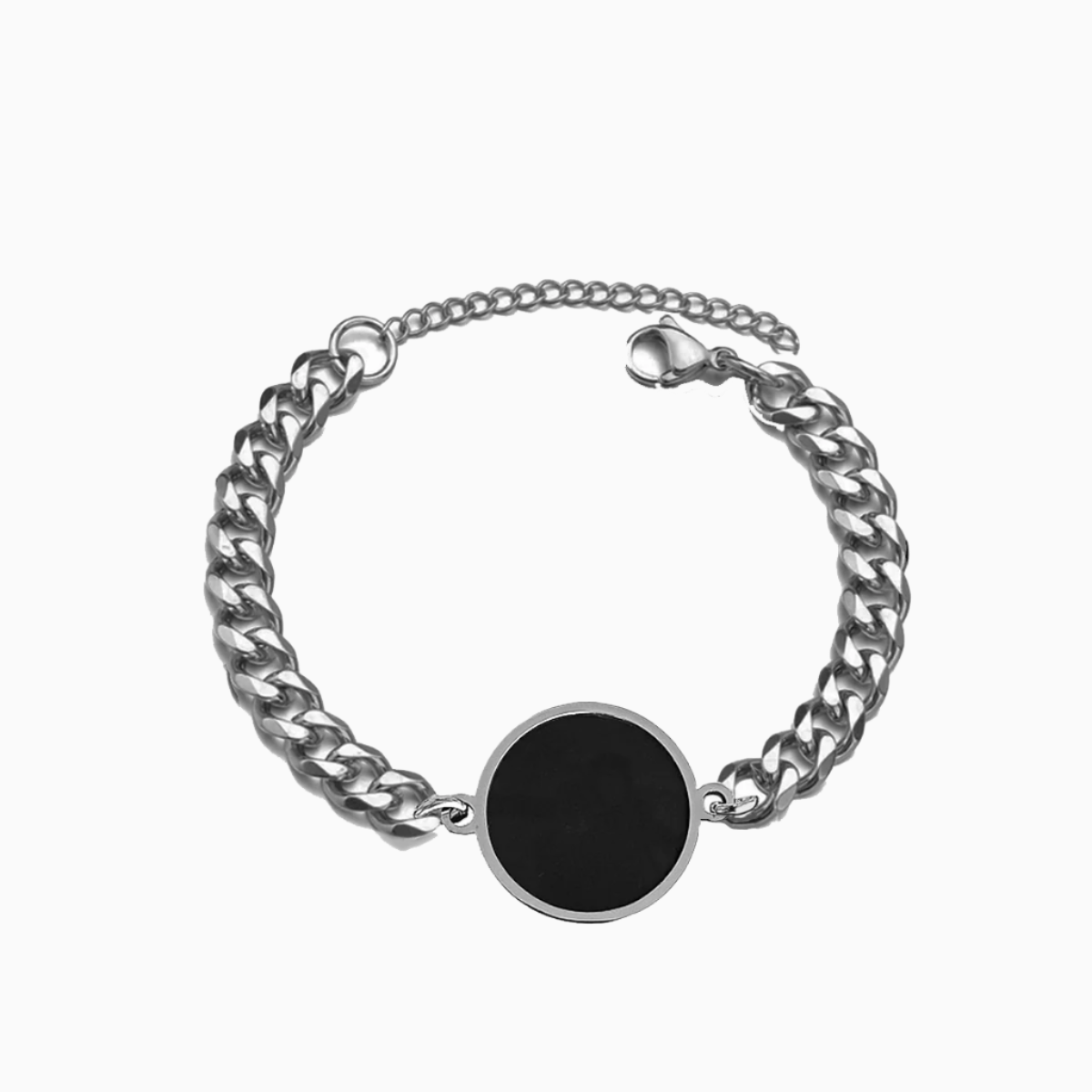 צמיד חוליות יוקרתי בעיצוב מודגש ומרשים, הכולל תליון עגול שחור שחושף את התמונה האישית שלכם במגע עם חום הגוף. פריט אופנתי עם משמעות עמוקה שמתאים לכל רגע מיוחד.