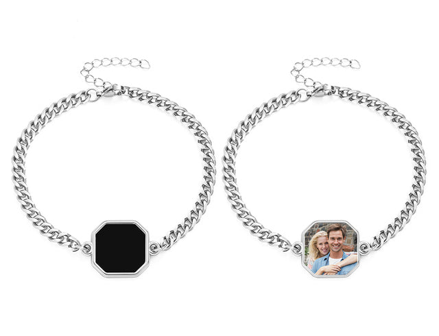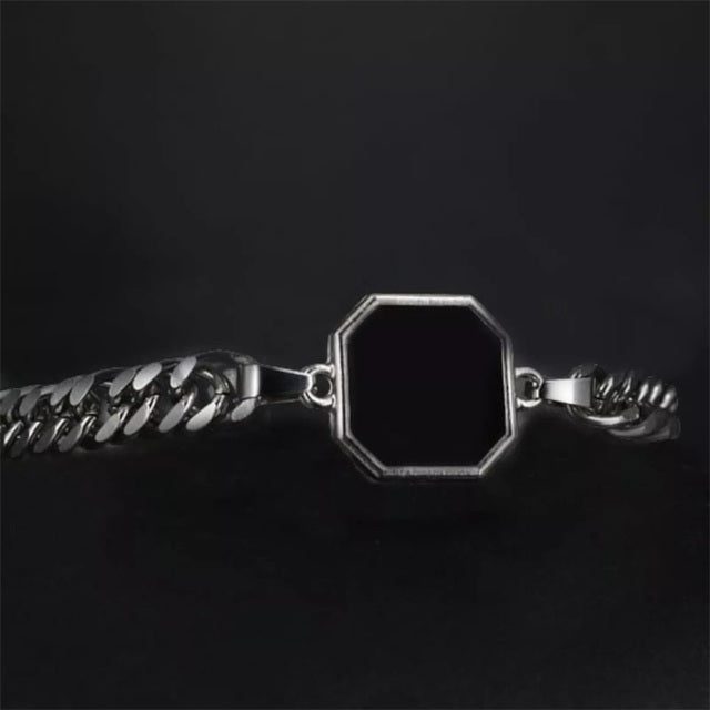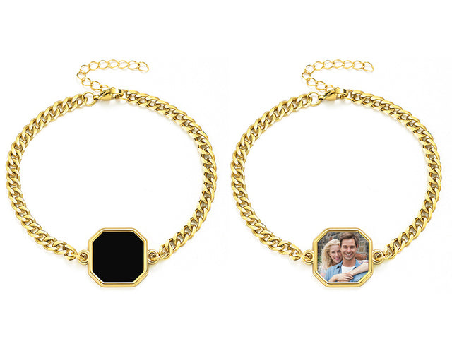 צמיד חוליות מרשים בעיצוב מודרני ואלגנטי, עם תליון מתומן בגוון שחור שמסתיר בתוכו את התמונה האישית שלכם. ברגע שהחום נכנס לתמונה, הצמיד מתעורר לחיים וחושף את הזיכרון המיוחד שתבחרו.